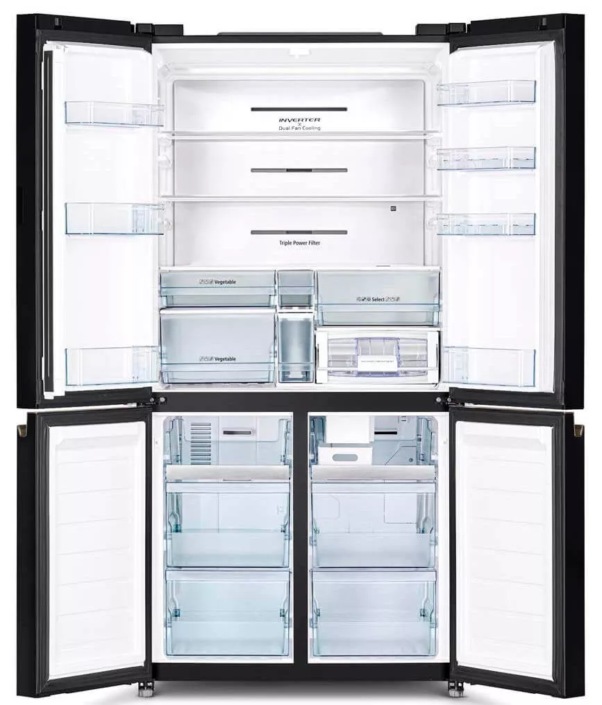 Hitachi R‑WB720VUC0 (GBK) — трёхкамерный четырёхдверный холодильник Side‑by‑Side с фронтальной панелью из чёрного стекла. Модель сочетает большой объём (568 л), инверторный компрессор, систему No Frost и передовые технологии Hitachi для максимальной свежести продуктов.