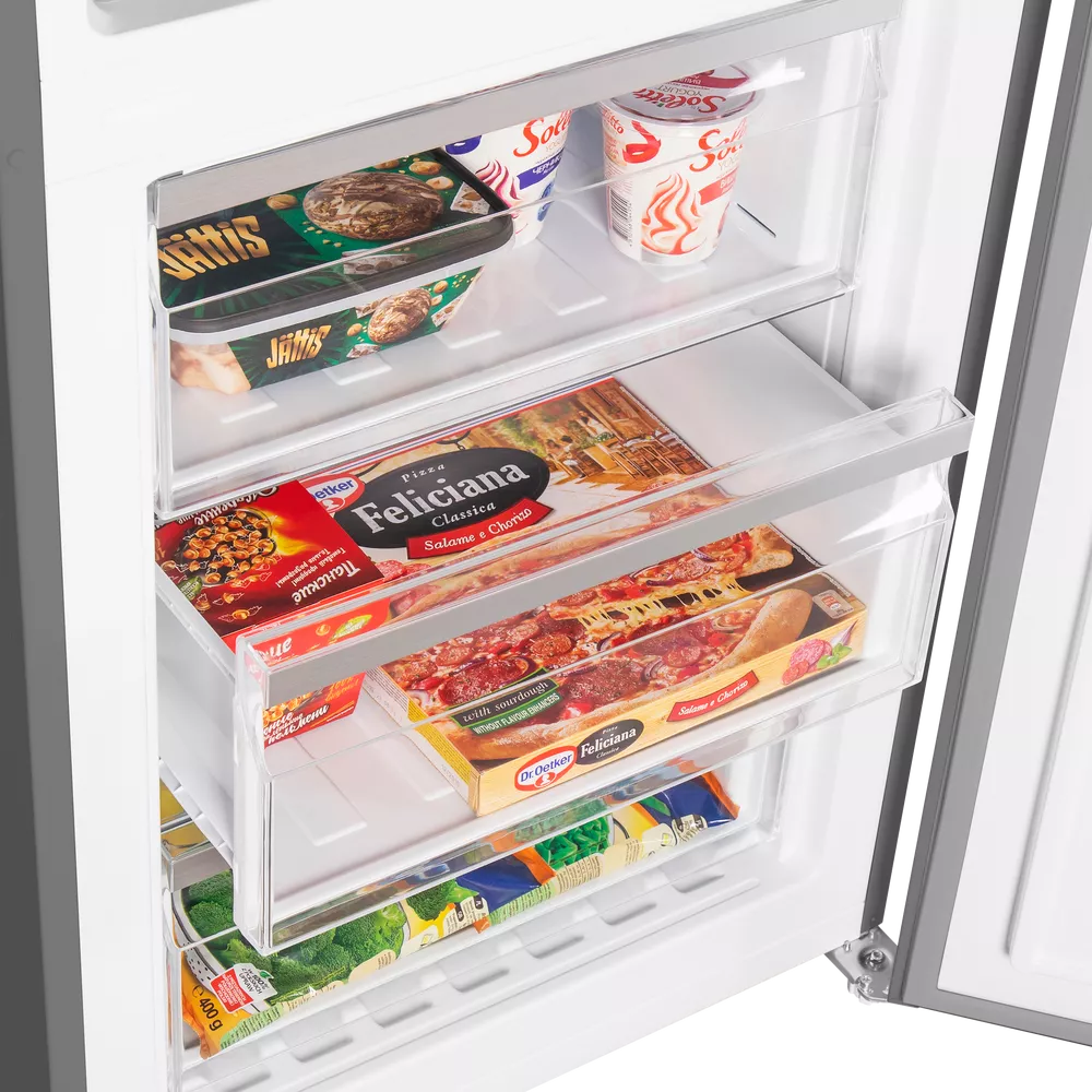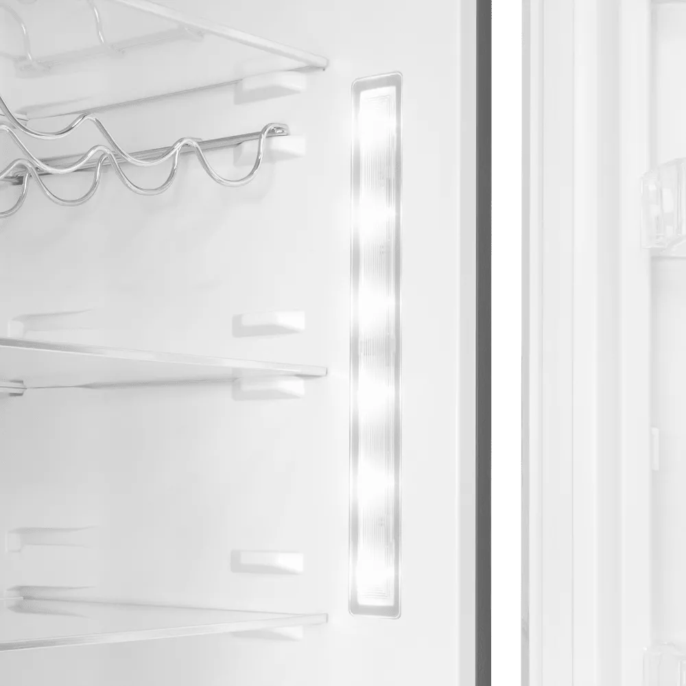 Внутреннее пространство легко адаптировать под ваши задачи: регулируемые полки, стойка для бутылок и гладкие поверхности помогают быстро навести порядок и поддерживать чистоту. При этом полезный объём 351 л позволяет комфортно разместить семейные запасы без компромиссов.
