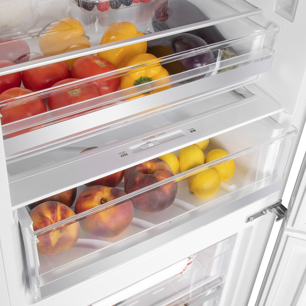 Общий объём 340 литров оптимально распределён между холодильной и морозильной камерами. В холодильнике вас ждут удобные стеклянные полки с окантовкой, большие корзины для овощей и фруктов, боковые полки на двери и решётка для бутылок; в морозилке — три выдвижных ящика и формочка для льда. На передней панели расположен сенсорный дисплей с быстрым доступом к режимам «Быстрая замораживание», «Отпуск» и «Смарт ЭКО».