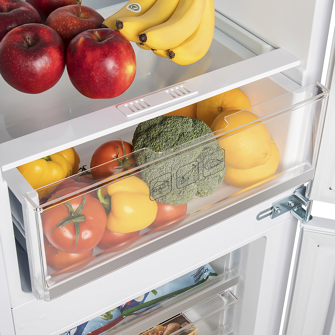 Внутри предусмотрены стеклянные полки с металлической окантовкой, ящик для фруктов и овощей, полки на двери и формочка для льда — всё, чтобы разложить продукты по категориям и быстро находить нужное. Низкий уровень шума 39 дБ позволяет установить прибор даже в кухне-гостиной, не жертвуя тишиной и уютом.