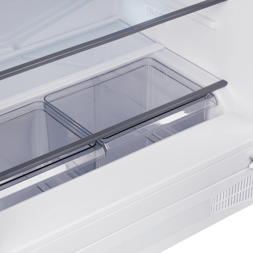 Сверху расположен морозильный отсек с отдельной дверцей, снизу — основная камера с продуманной внутренней организацией. Две стеклянные полки и дверные карманы помогают поддерживать порядок, а внутреннее электронное управление делает настройку температуры наглядной и простой.