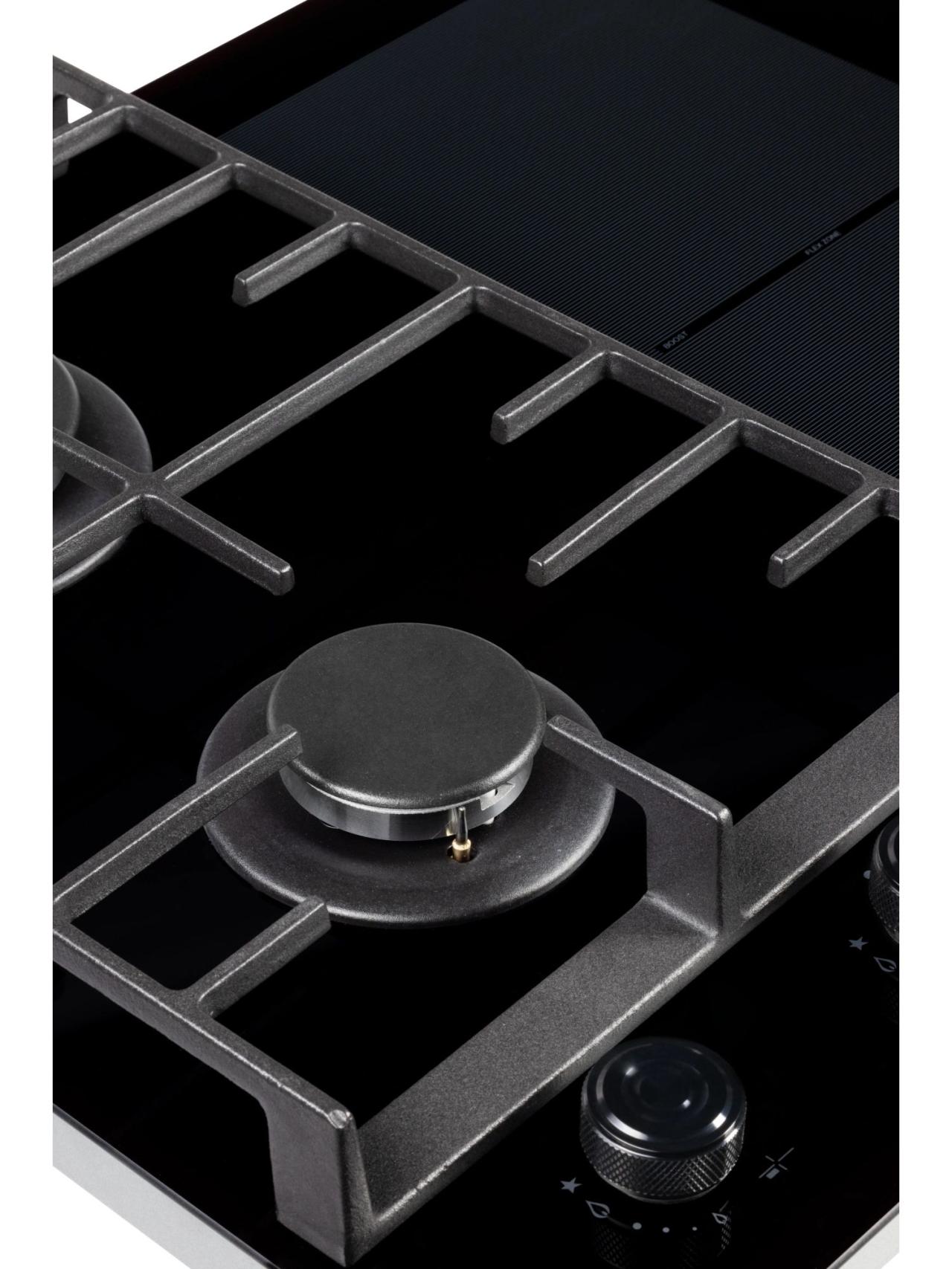 Газовая часть включает две конфорки с автоматическим розжигом от ручки и системой газ-контроля для безопасной эксплуатации. Чугунные решетки обеспечивают устойчивость посуды и рассчитаны на интенсивное использование. Наличие сенсора распознавания посуды и индикатора остаточного тепла добавляет уверенности при работе.