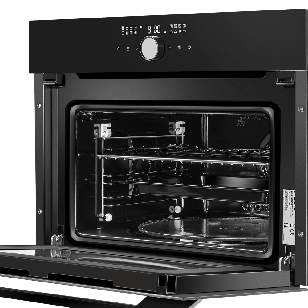 Модель поддерживает расширенный набор функций: 15 режимов работы включают гриль, комби-режимы с микроволнами, конвекцию и «Воздушную сушку» для бережного обезвоживания фруктов, овощей и трав при 60–100 °C. Уход упрощает гидролизная очистка и эмаль легкой очистки, отталкивающая жир и влагу.