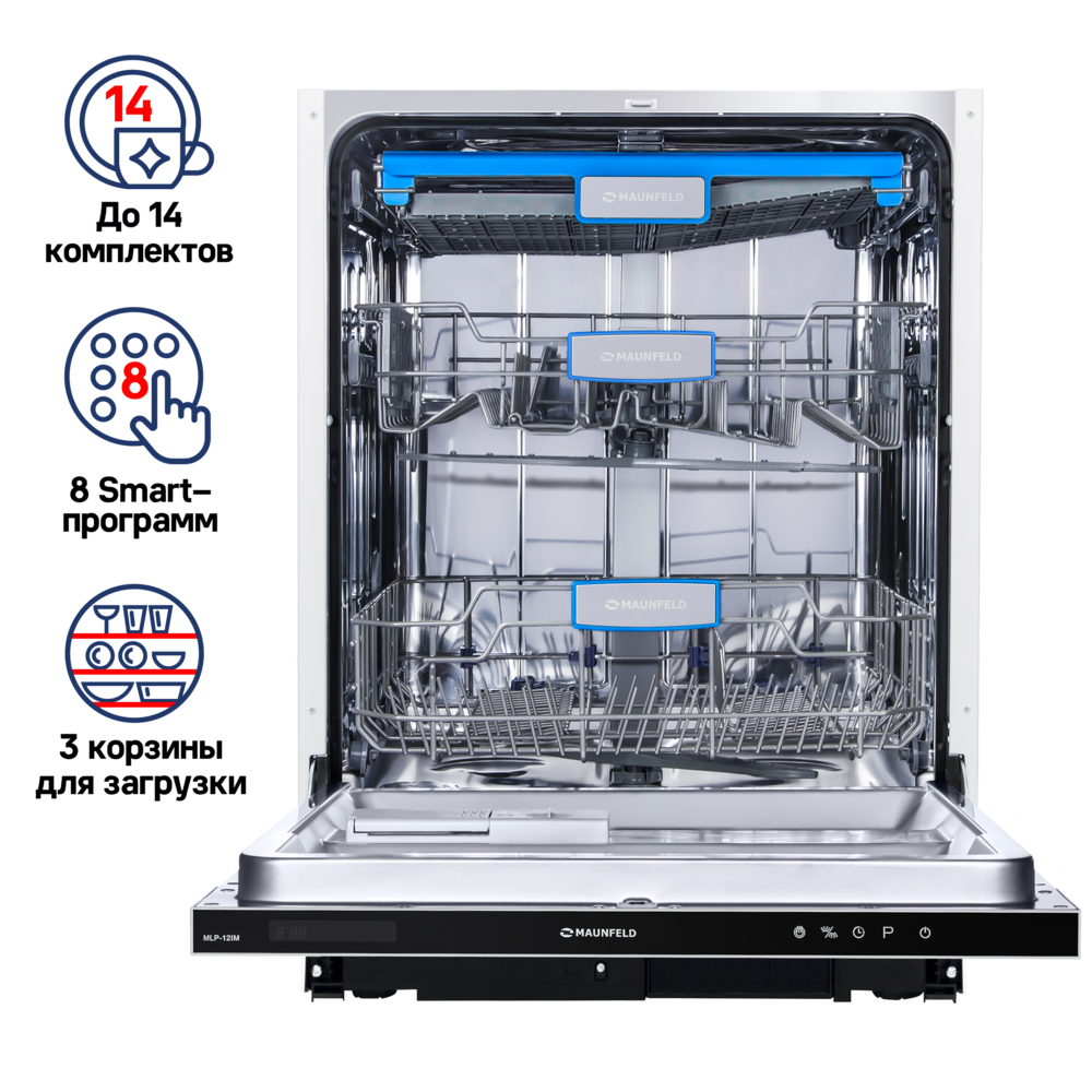Полноразмерная встраиваемая посудомоечная машина MAUNFELD MLP-12IM сочетает в себе современный дизайн и высокую функциональность. Она оснащена специально разработанными корзинами и дополнительным выдвижным лотком для столовых приборов, что позволяет вымыть до 14 комплектов посуды за один цикл. Внутренняя поверхность из нержавеющей стали толщиной 0.6–0.8 мм гарантирует долговечность и надежность даже при активной эксплуатации.