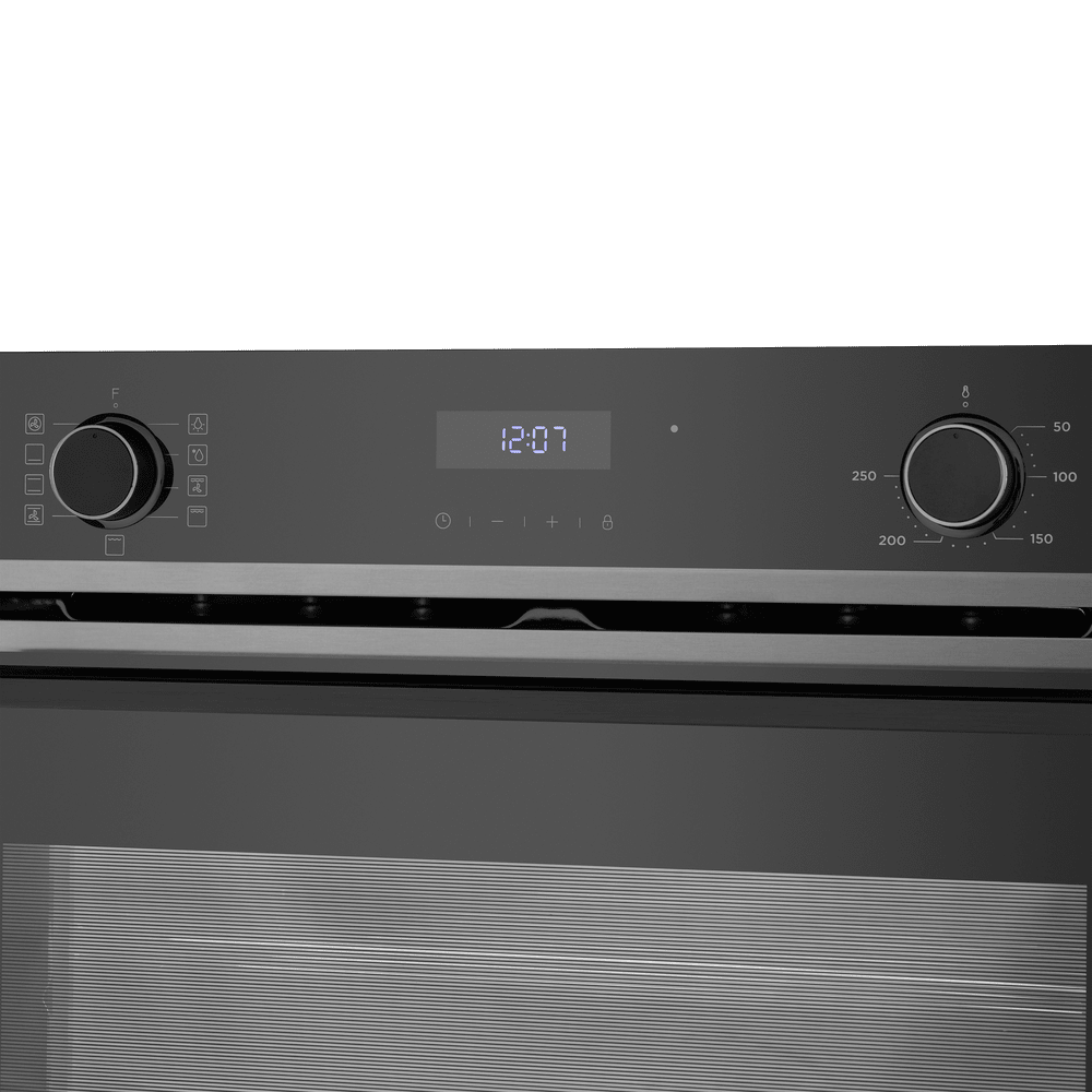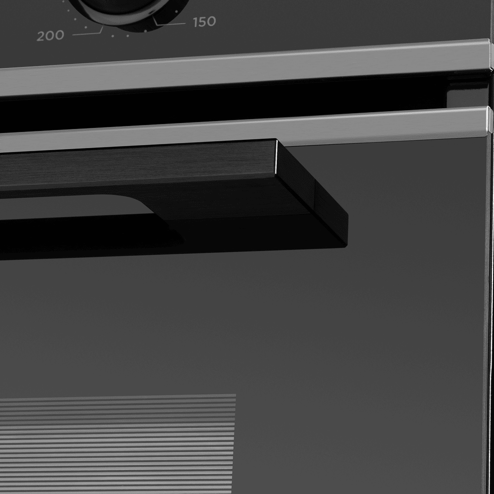 В отделке блока управления используется жаропрочное стекло, которое не выцветает и не боится высоких температур, сохраняя презентабельный вид на долгие годы. Внутреннее покрытие выполнено эмалью легкой очистки: осевший жир легче удаляется, поэтому уход за духовкой не отнимает много времени. Телескопические направляющие и хромированные элементы добавляют удобства при ежедневной эксплуатации.