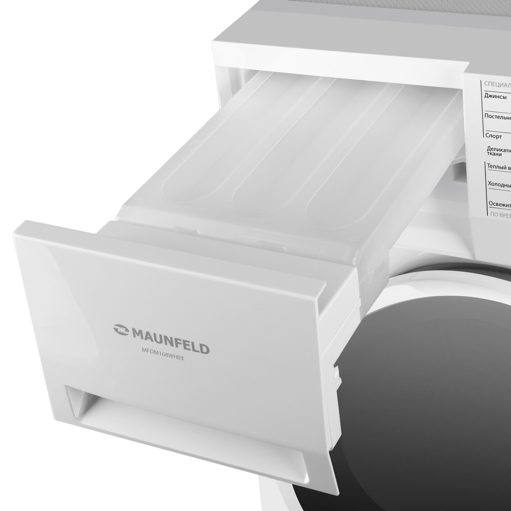 MAUNFELD MFDM168WH03 рассчитана на семейные объемы — загрузка 8 кг помогает закрывать недельные партии белья за меньшее число циклов. Режим «Антисмятие» снижает риск заломов, а блокировка от детей добавляет уверенности в безопасности техники.