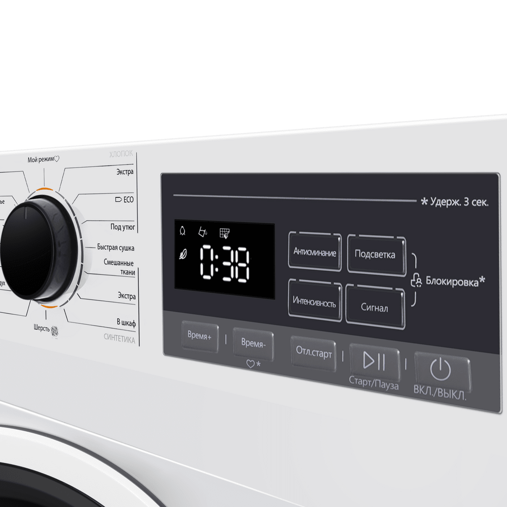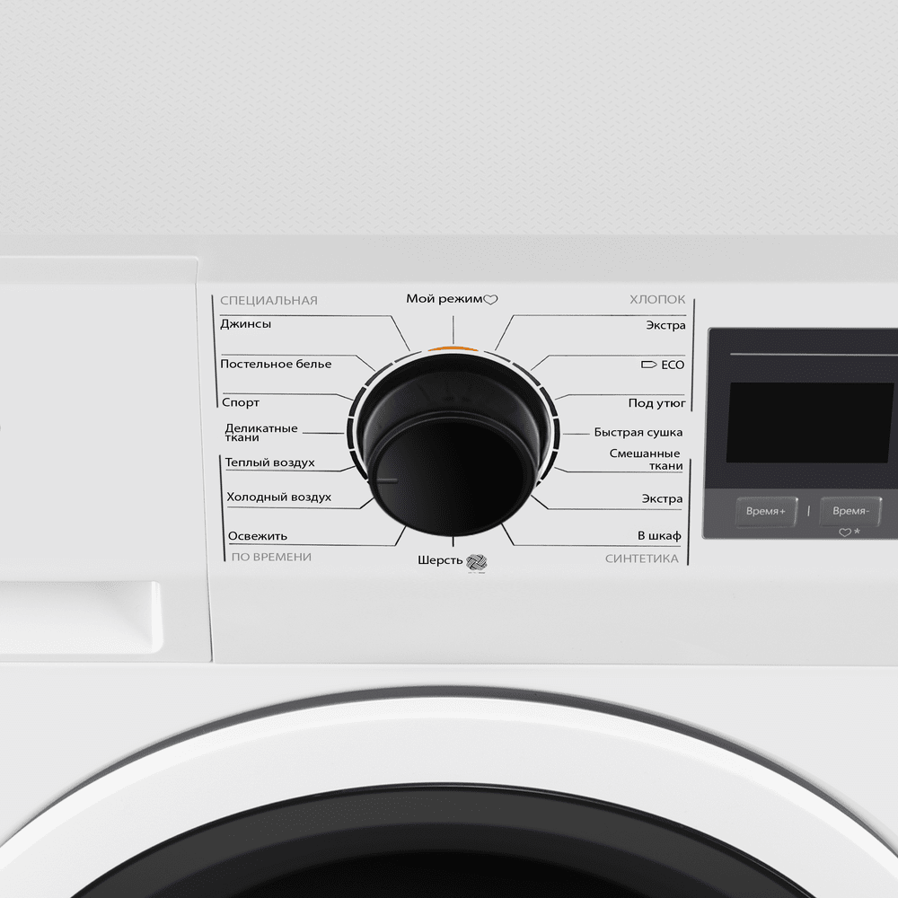 Для повседневного комфорта предусмотрены «Мой режим», внутренняя подсветка и понятный дисплей: вы легко настраиваете параметры под себя, контролируете процесс и быстро находите нужные вещи в барабане. Датчик влажности сам корректирует продолжительность цикла, чтобы не пересушивать ткани и экономить ресурсы.