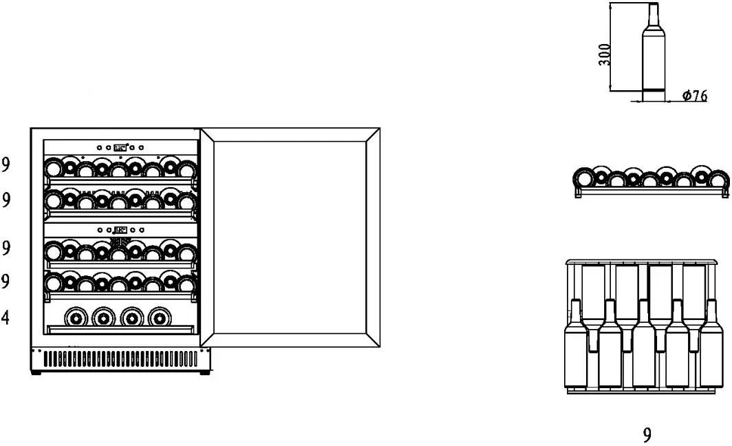Пять съемных полок из дерева предназначены для правильного хранения вина: бутылки кладутся горизонтально (вместительность – 40 бутылок). Деревянные полки оборудованы фиксаторами от самопроизвольного выдвижения и компенсируют механические воздействия компрессора и вентилятора. Параметры холодильника задаются вручную, а также при помощи мобильного приложения «CASO-App». Возможна удаленная смена настроек из любой точки мира. Управление осуществляется при помощи двух сенсорных панелей. Регулировка температурных показателей с шагом в 1°C происходит нажатием « ∧ » и «∨». Управление внутренним освещением возможно при помощи кнопки «Свет». Встроенные светодиоды не нагреваются, и внутренний микроклимат остается максимально благоприятным для хранения бутылок.