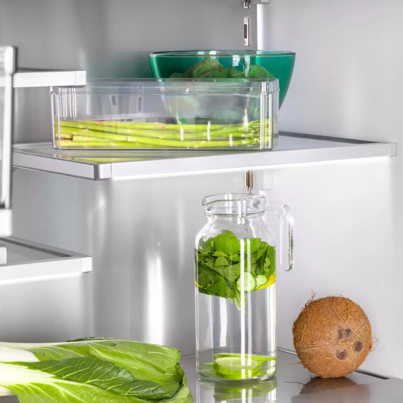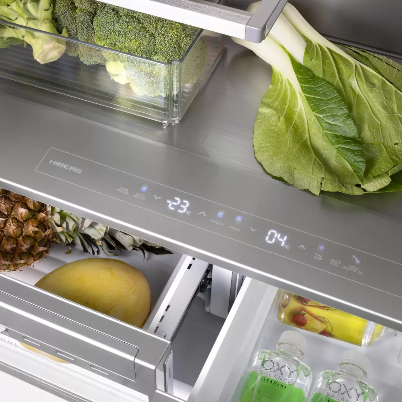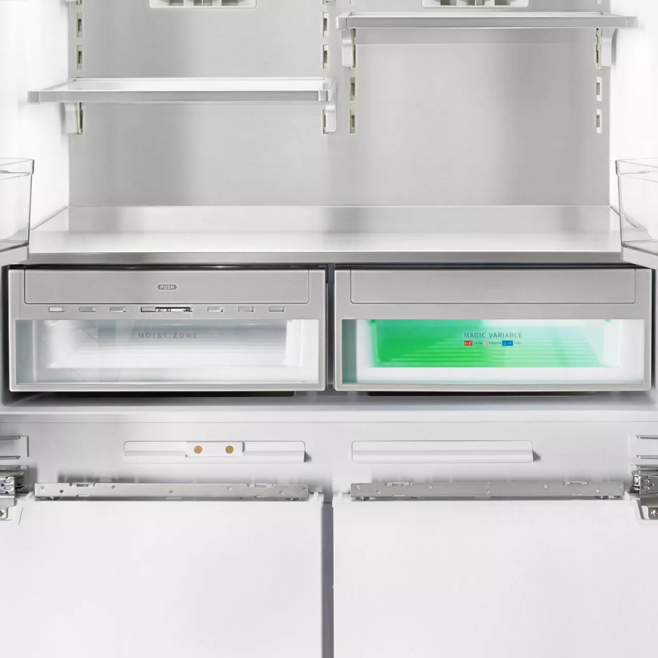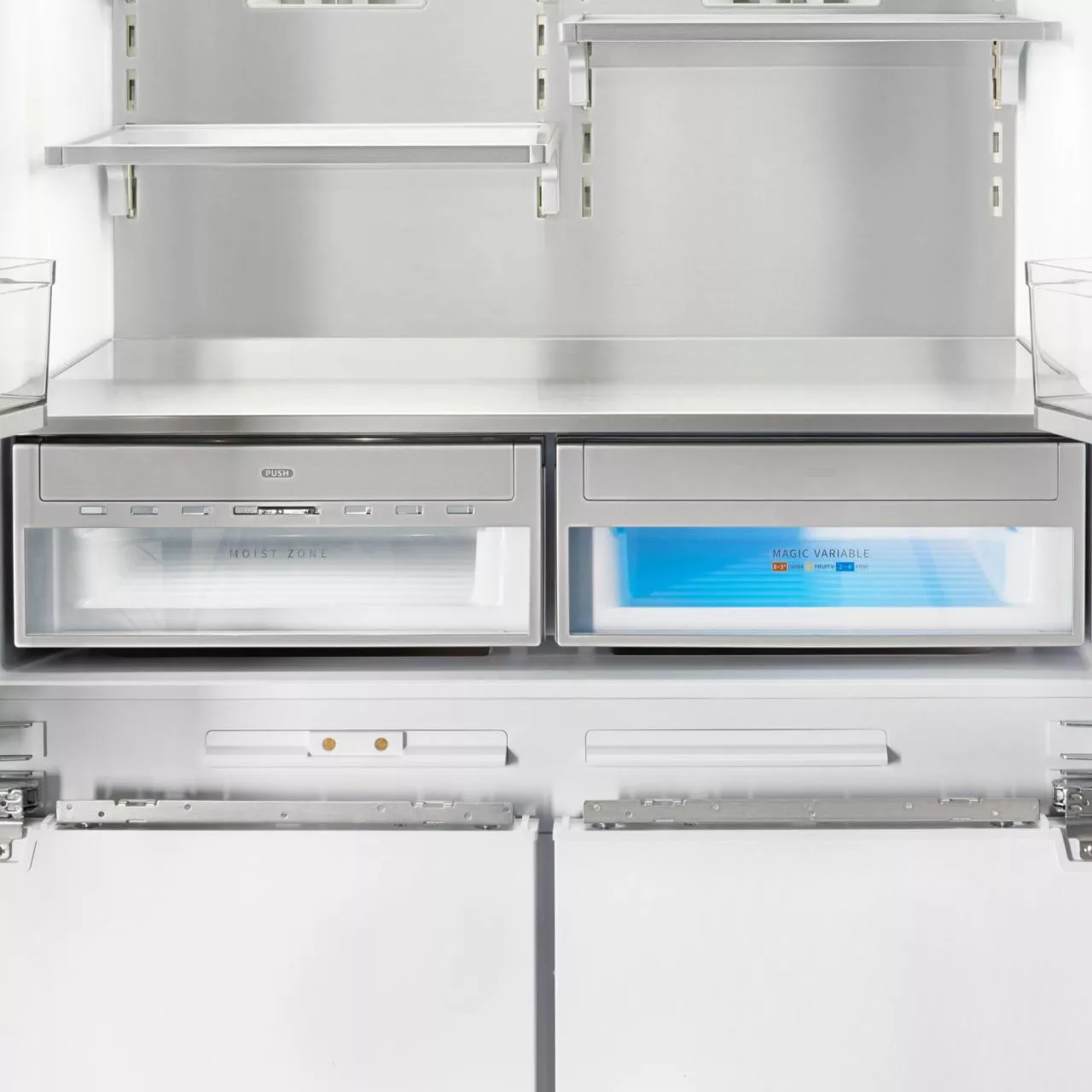 — 2 выдвижных ящика для овощей и фруктов (зона влажности и ящик с индивидуальной зоной охлаждения);