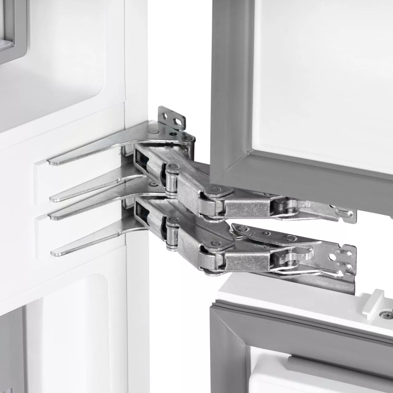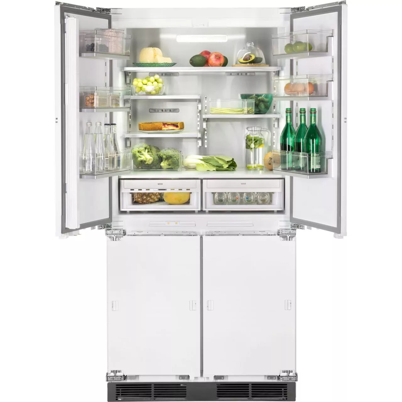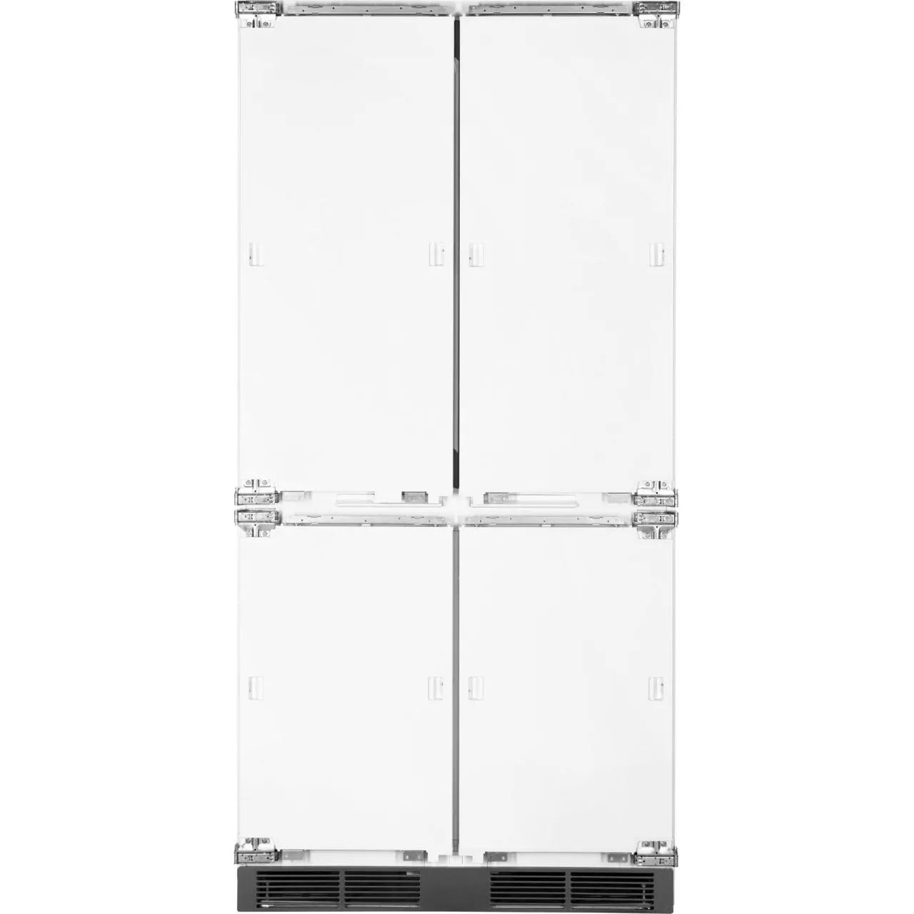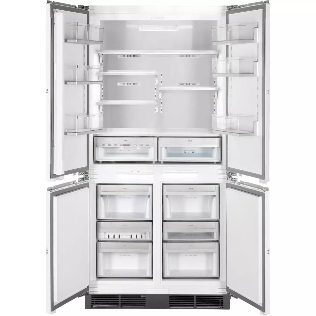 Благодаря четырехдверной конструкции и открыванию дверь в дверь пользователь получает доступ к продуктам, не выпуская при этом холод из остальной части холодильника. Модель имеет жесткую систему крепления фасадов: они не связаны с корпусом шкафа, не предполагают наличие дополнительных петель. Холодильник имеет неограниченный угол открывания, отсутствуют зазоры, в которых могут скапливаться загрязнения.