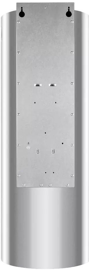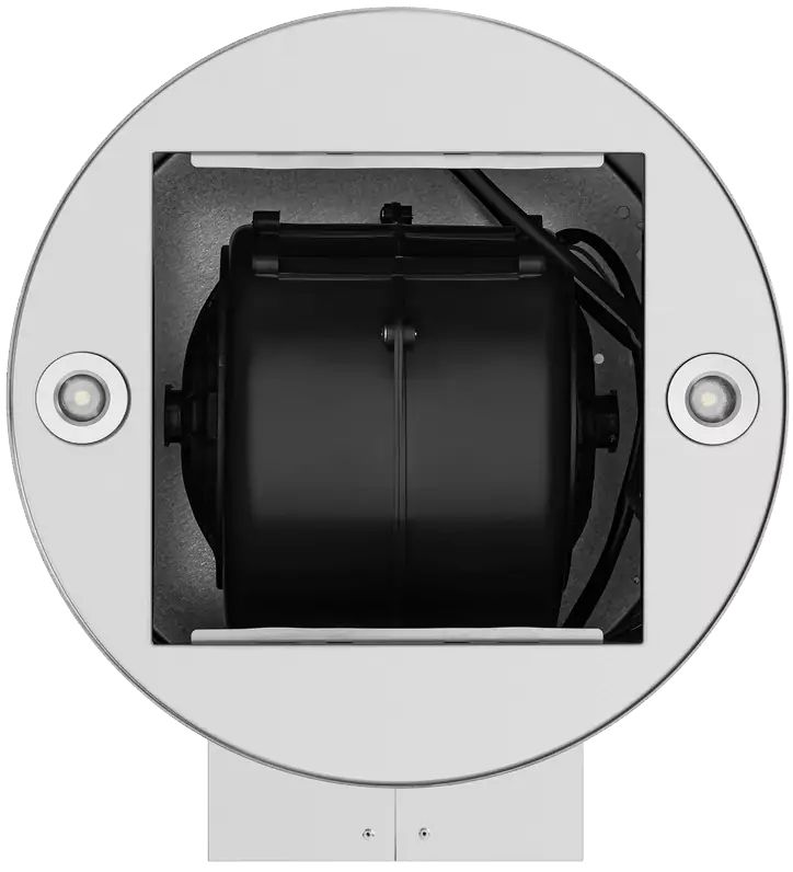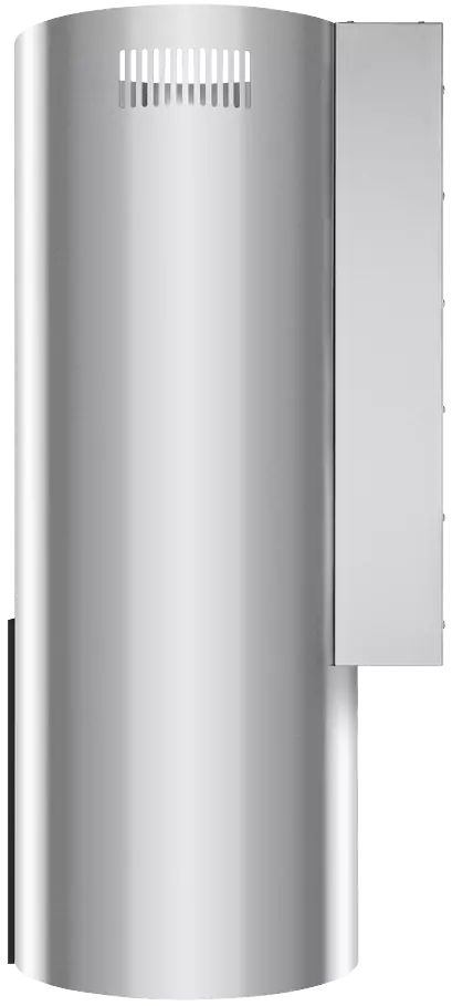 Корпус цилиндрической формы, выполненный из нержавеющей стали с термостойким покрытием, устанавливается на стену над поверхностью плиты. Алюминиевый многослойный жироулавливающий фильтр находится в нижнем торце вытяжки.